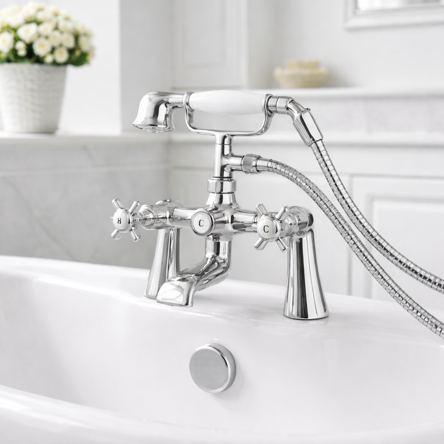 The Cashel Traditional Bath Shower Mixer is the definitive choice for those looking to capture the grandeur of a Victorian-era bathroom. Defined by its beautifully sculpted cross-head handles and iconic telephone-style cradle, this mixer serves as a stunning focal point for any traditional bath. The high-shine polished chrome finish is paired with classic "Hot" and "Cold" ceramic indices, ensuring that every detail reflects authentic period styling while providing modern, reliable performance.